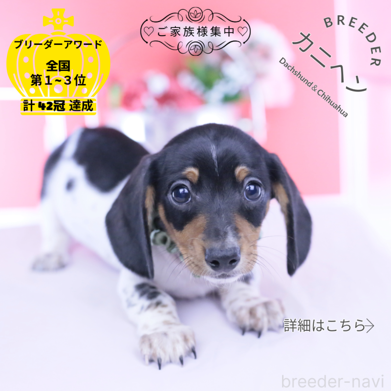 カニンヘンのスムーズ、男の子を探しており、珍しいパイボールドをブリードしているこちらに選ばせて頂きました。 ダックス専門のブリーダーさんで、経験も豊富とのことで、購入するペットたちに関しては、ある程...